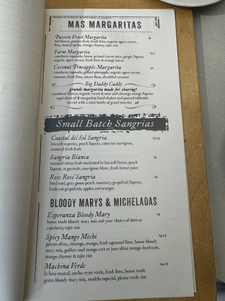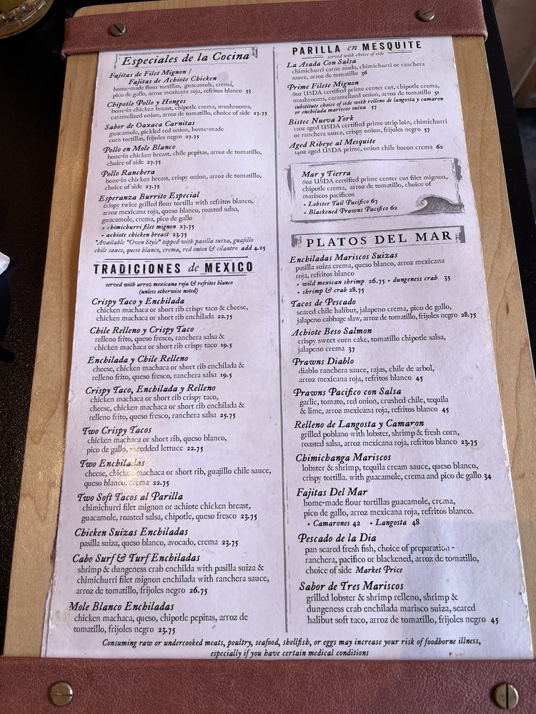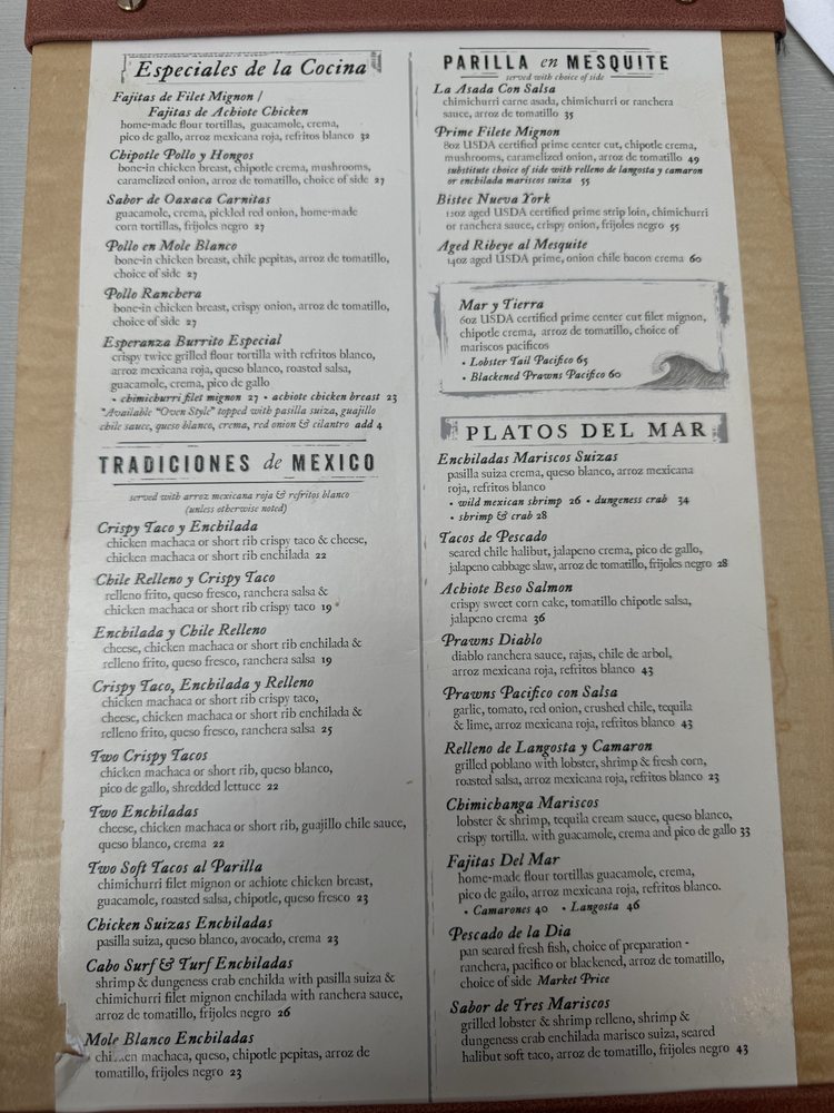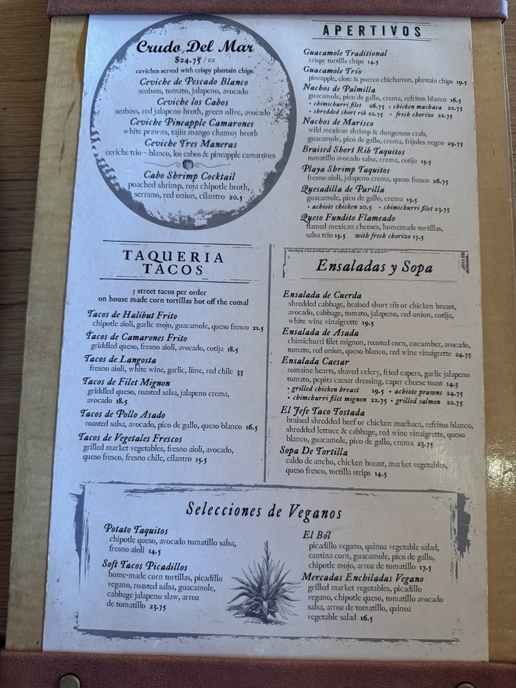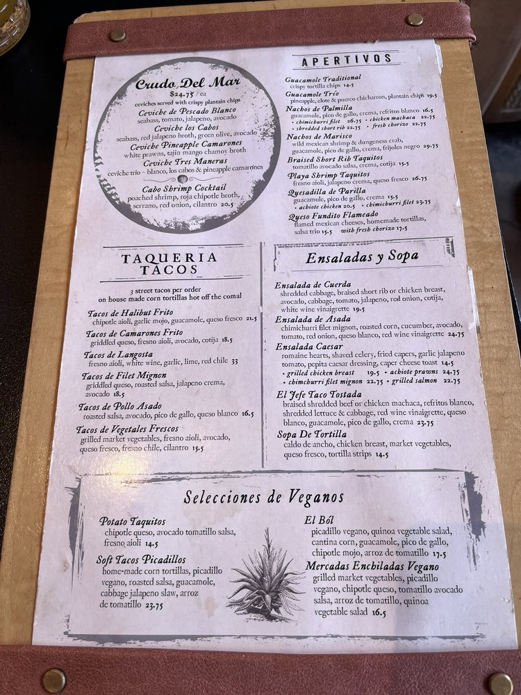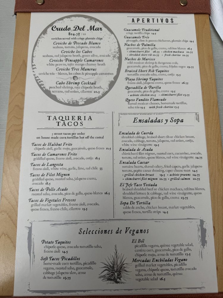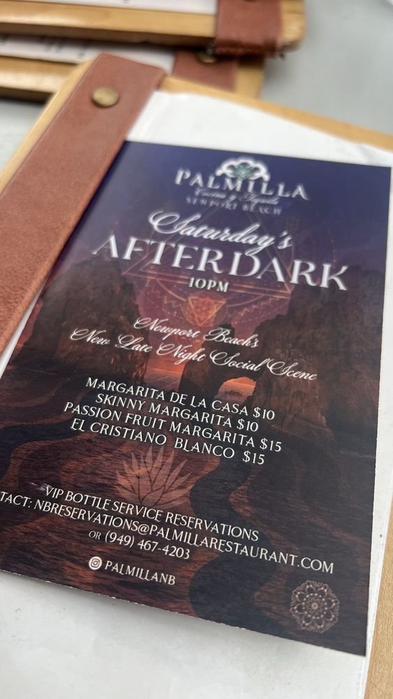 Introducing the menu at Palmilla Cocina y Tequila, a trendy and upscale Mexican seafood bar in Newport Beach, CA. Offering a range of vegan options, the restaurant is wheelchair accessible and provides valet parking. The ambiance is soothing with options for outdoor seating, making it perfect for a romantic dinner or group gatherings. Customer reviews rave about the fresh tortilla starters, vegan tacos, and unique cocktail options. The surf and turf enchiladas and achiote salmon are highlighted dishes, with exceptional service from friendly staff members. The Latin-inspired decor adds to the vibrant atmosphere, creating a unique dining experience. Don't miss the house-made tortillas with butter and sauces, and be sure to try the ceviche and plantain chips. Overall, Palmilla Cocina y Tequila offers a delightful mix of flavors and ambiance for a memorable dining experience.